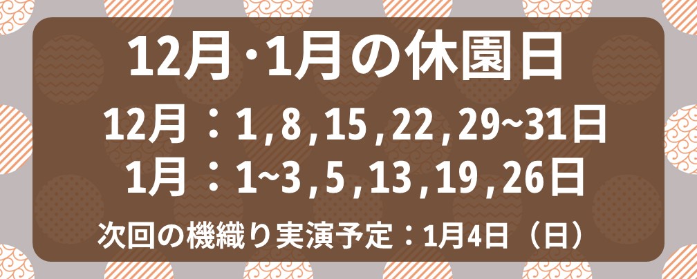 | 休園日 | 月曜日・年末年始(12/29~1/3) (月曜日が休日の場合はその翌平日) |