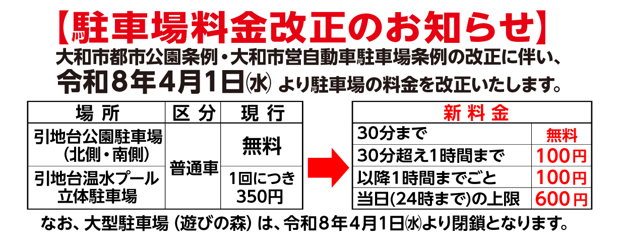 | 施 設 | 野外音楽堂・売店(休業中) ・噴水・令和広場・平成広場・ピクニック広場・ふるさと川・駐車場・駐輪場・引地台公園管理事務所・大和スタジアム・引地台温水プール