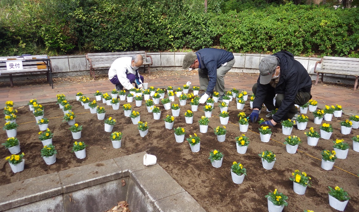 ボランティアのみなさんと公園内の花壇に寒さに強いビオラとチューリップの球根を