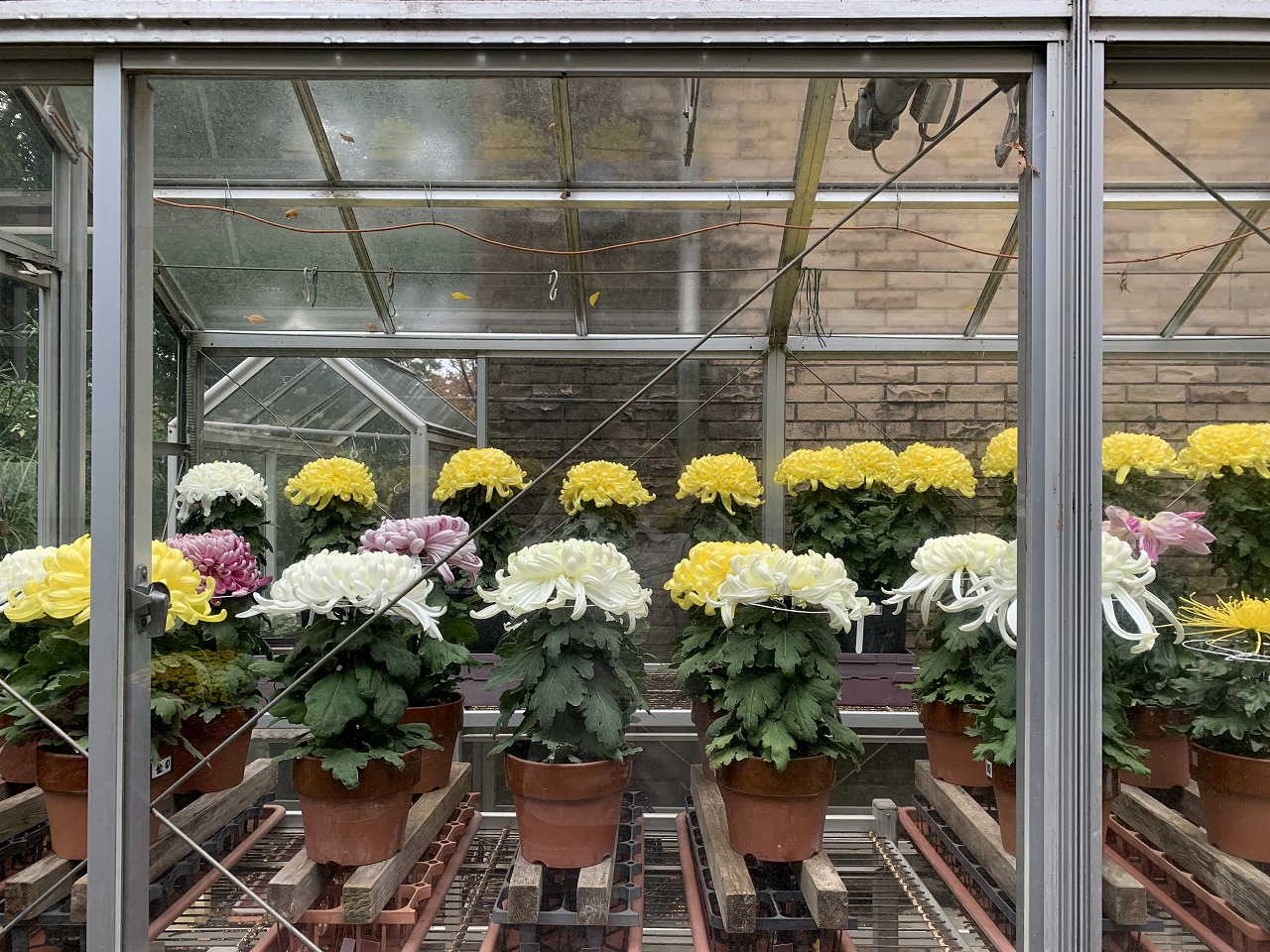 大菊の三本仕立てや竹を45cm以内に仕立てる福助づくりなど、丹精込めて育てた見事な菊、100点以上の作品を見ることができます