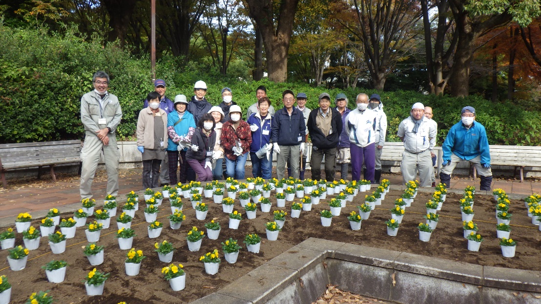 ボランティアのみなさんと公園内の花壇に寒さに強いビオラとチューリップの球根を