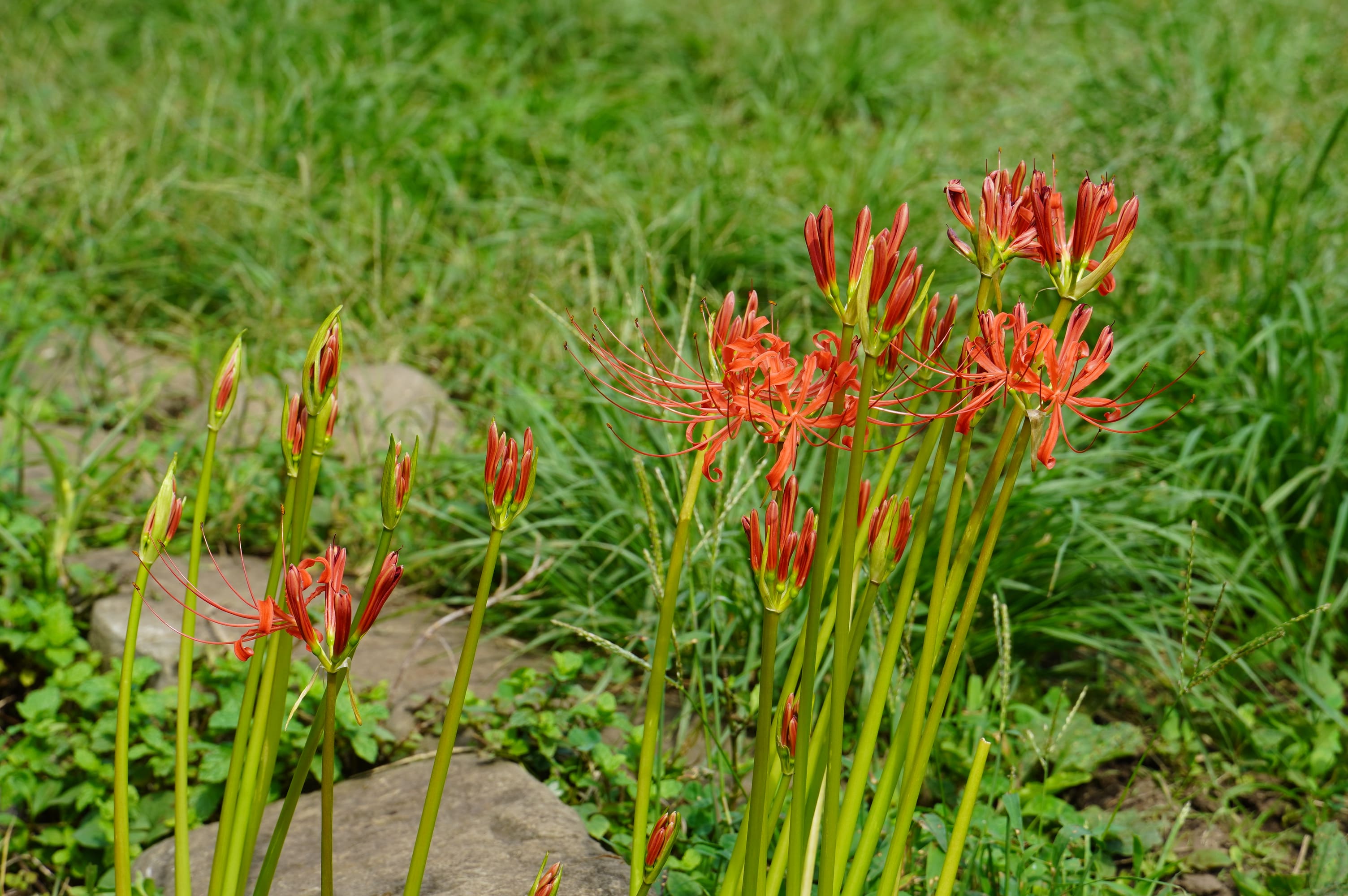 赤いヒガンバナは、遺伝的に実が熟さない「三倍体」の植物なので、球根を分けて株を増やします。ソメイヨシノのように、よく見かけるヒガンバナはすべて同じ遺伝子型のクローンということになります。