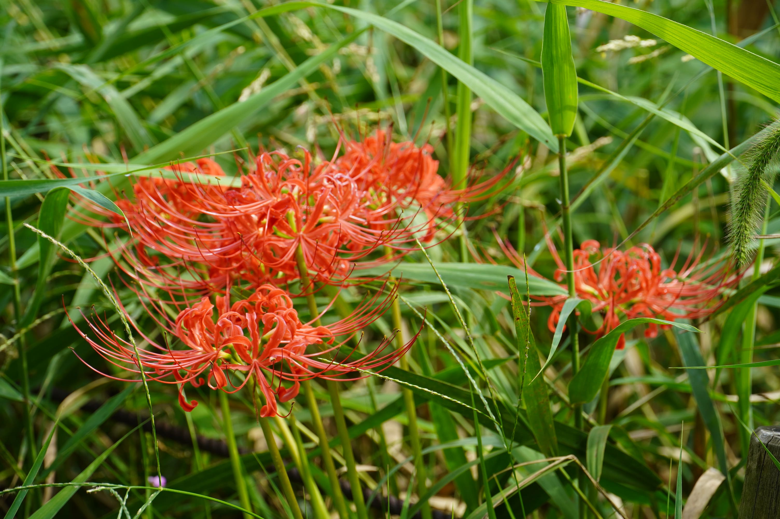 あっという間に園内のヒガンバナが開花しました。園内では赤いヒガンバナが点在して咲いています。