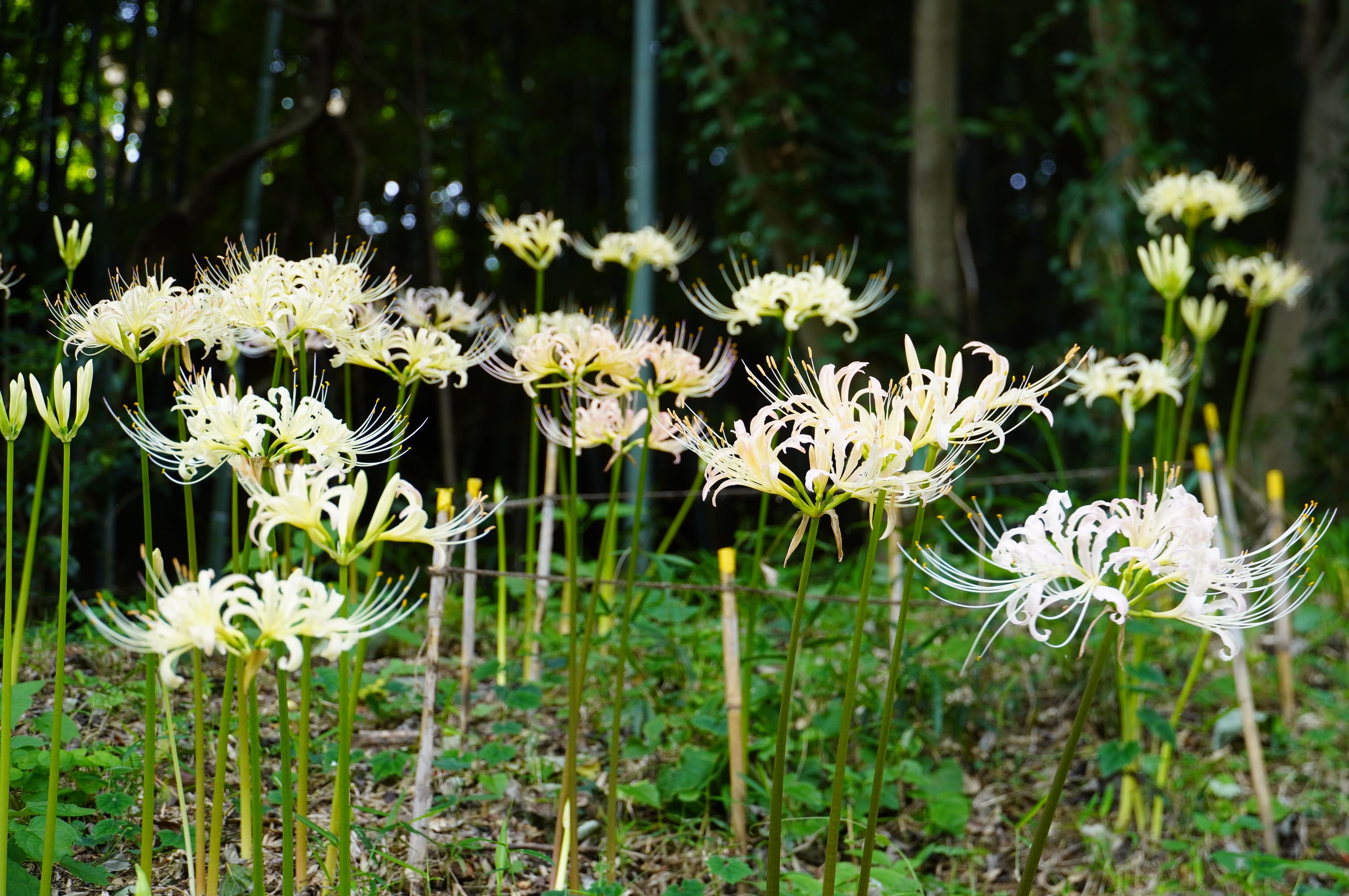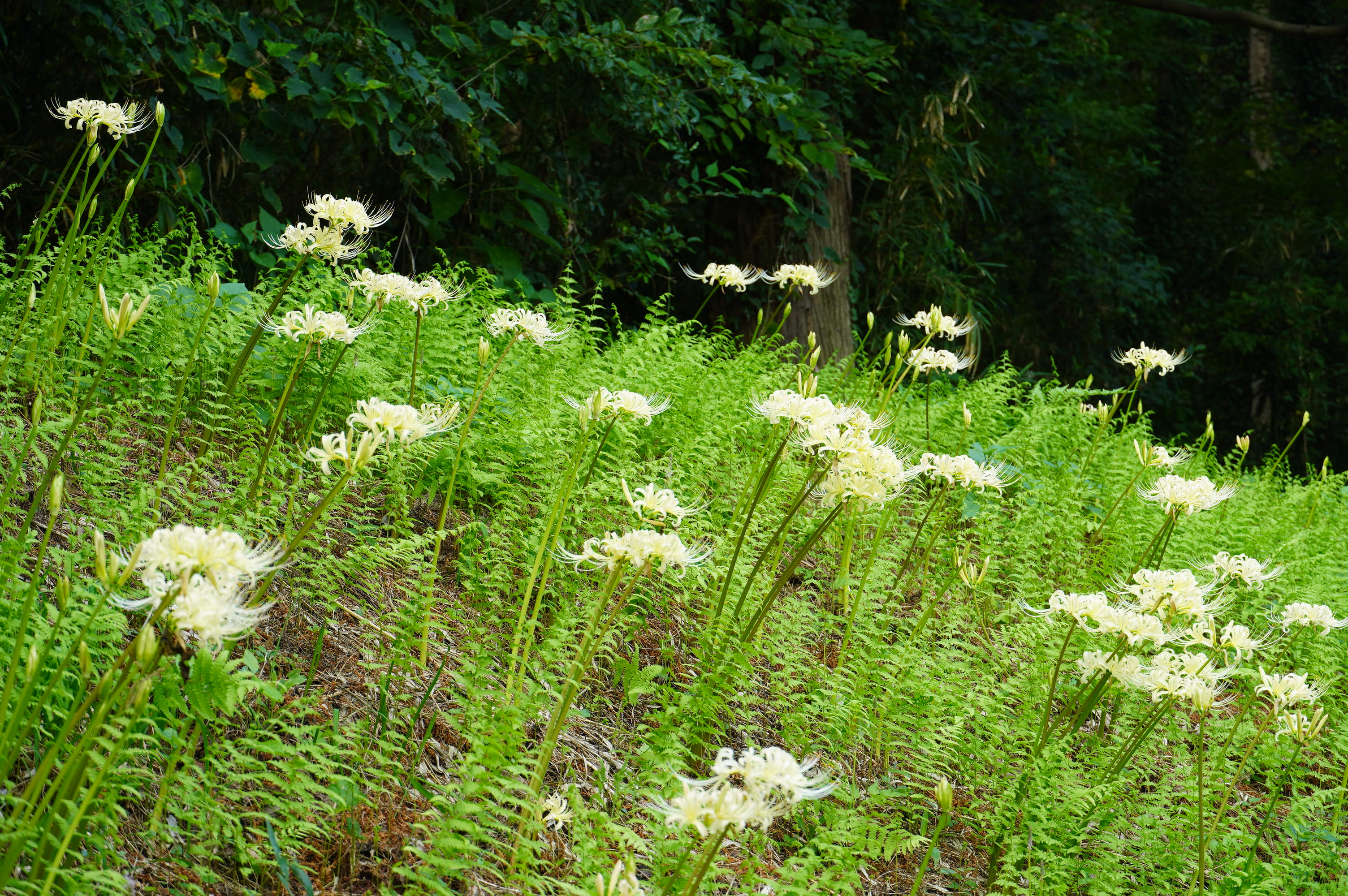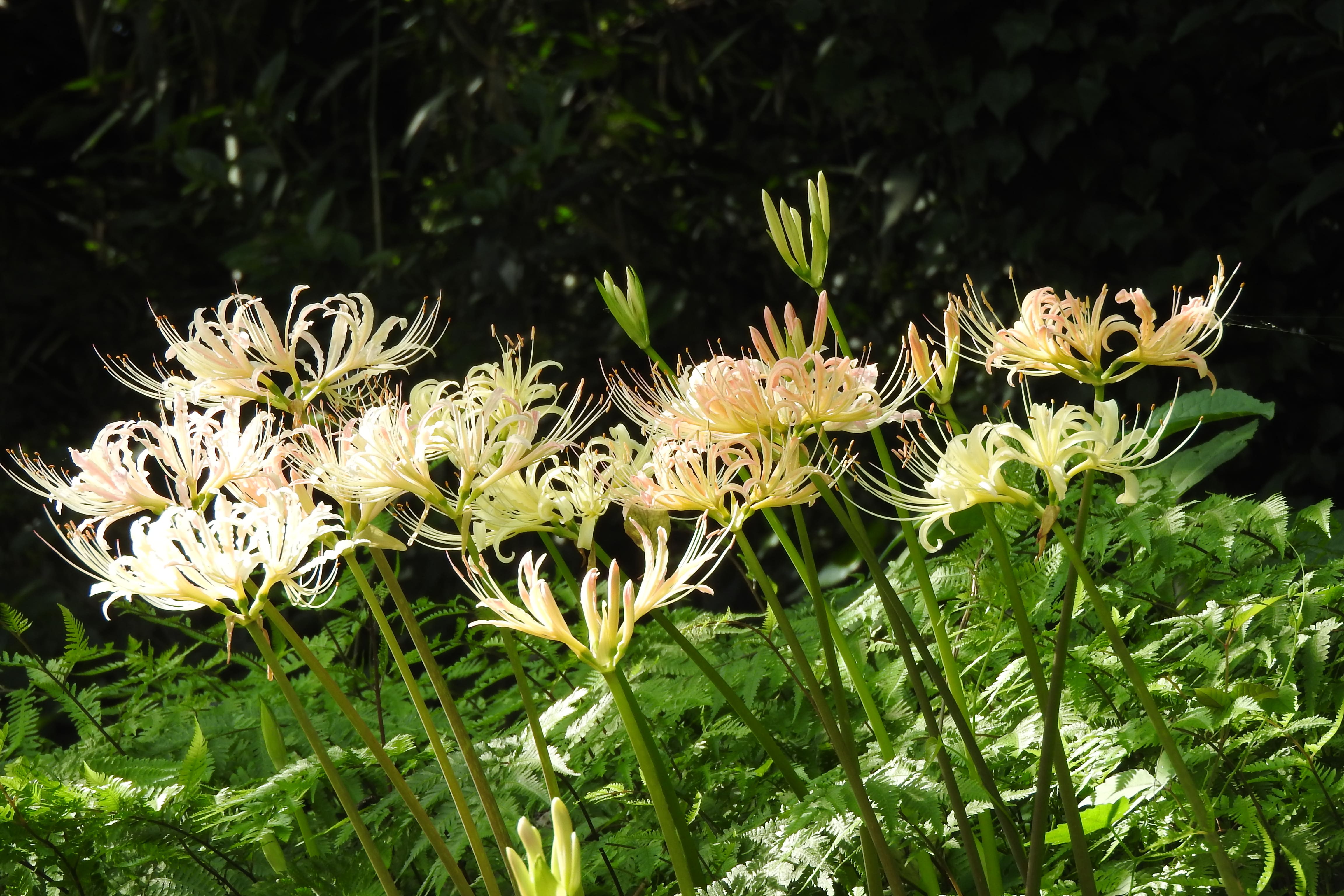 一方、白いヒガンバナは、ヒガンバナの原種「コヒガンバナ」と黄色い花をつける「ショウキズイセン」の雑種と考えられています。白花の一部がピンク色になっているのは、コヒガンバナ由来の赤色が強く出ているということなのでしょう。