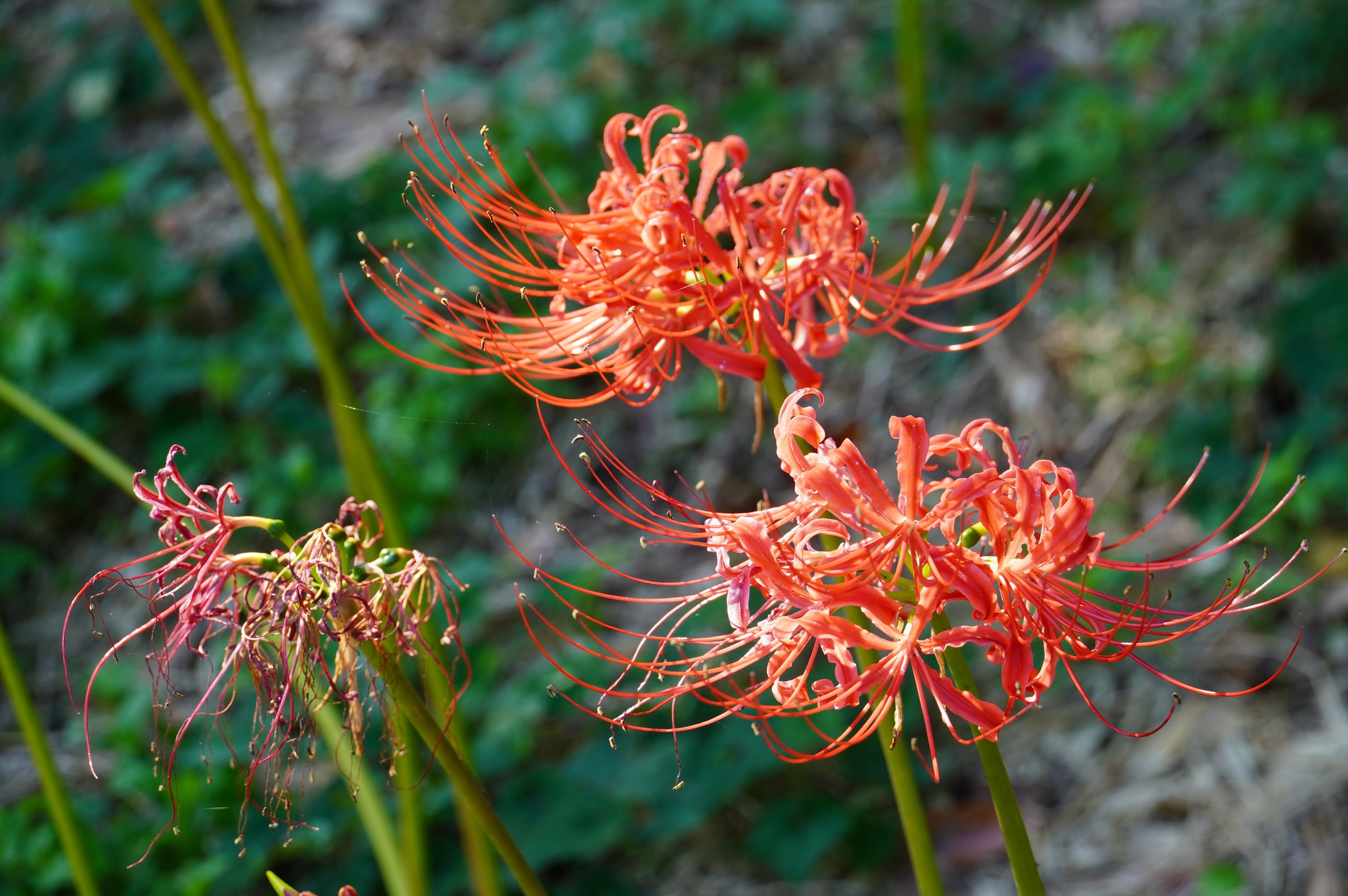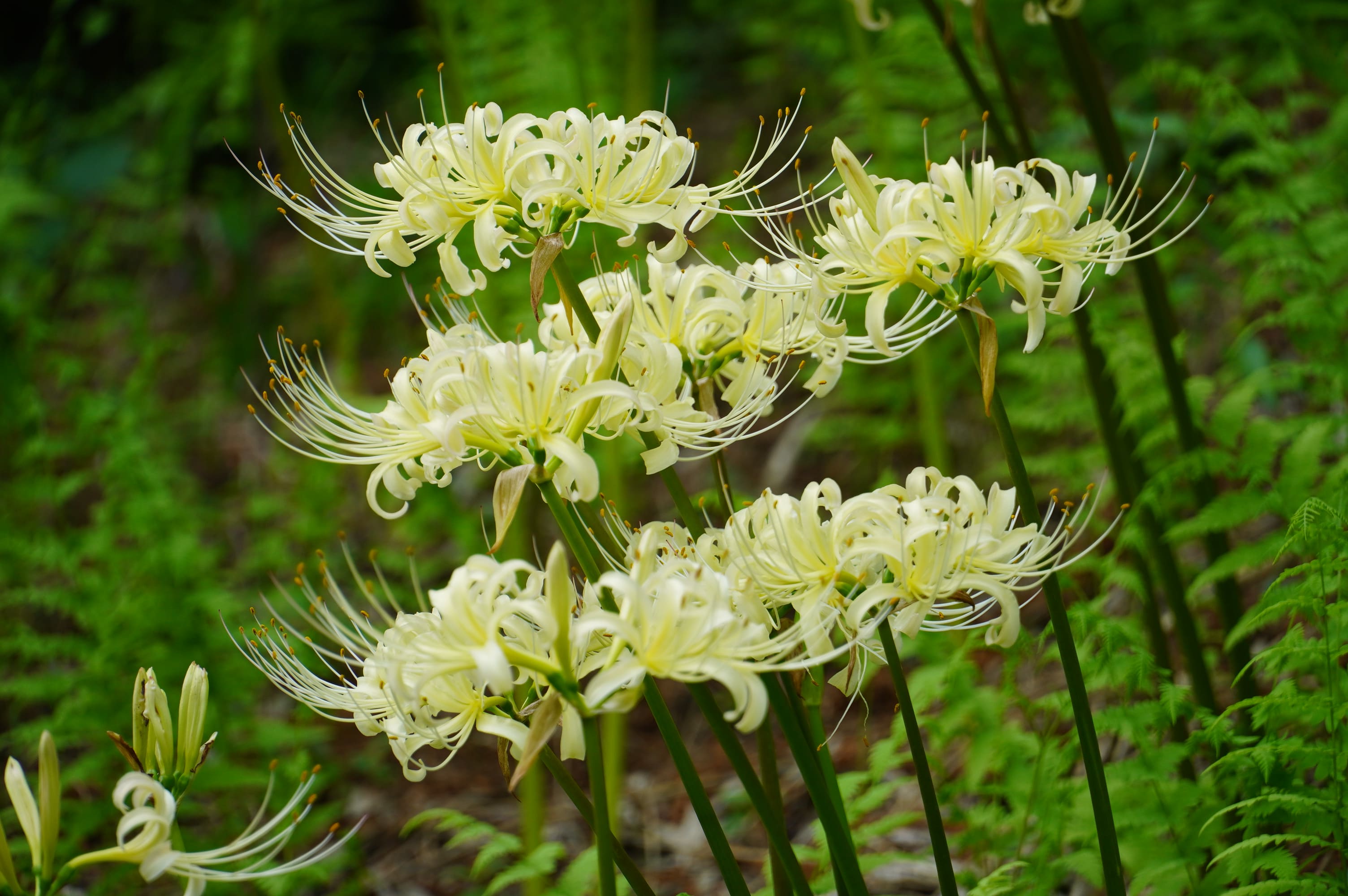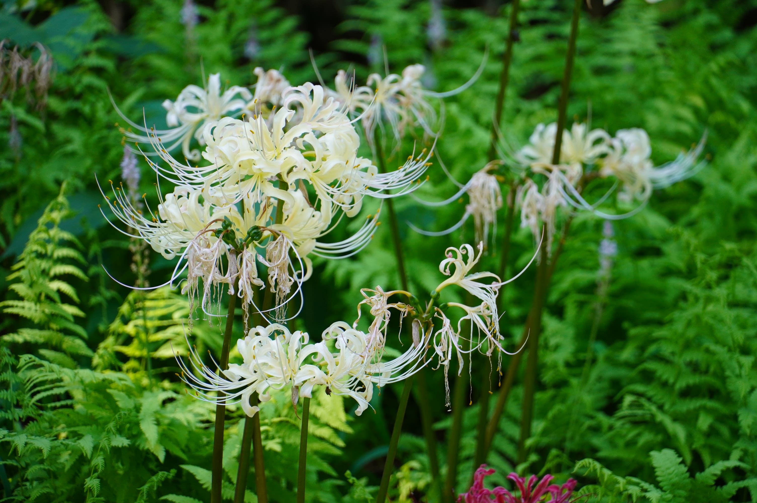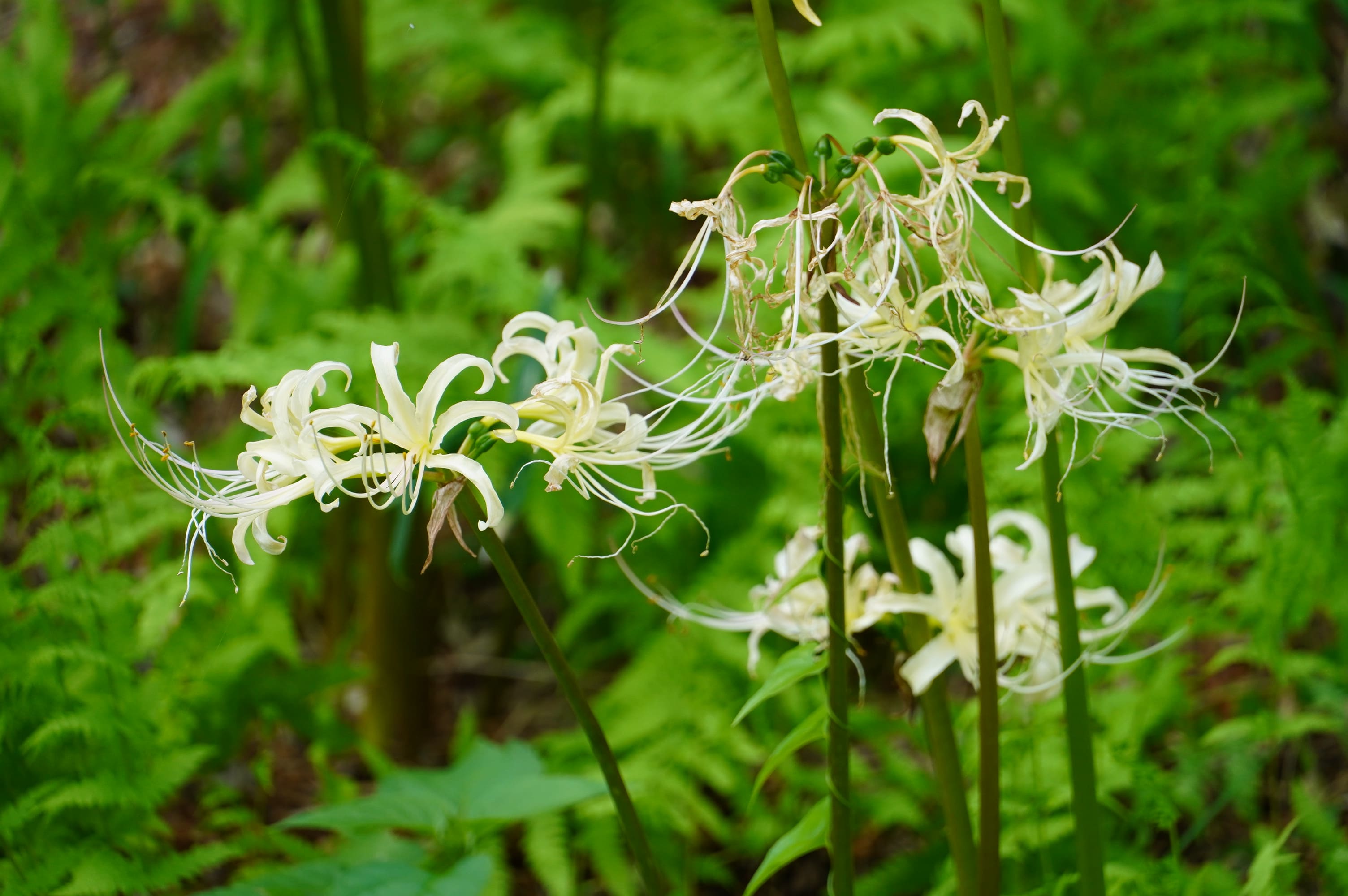 一方、白いヒガンバナは、ヒガンバナの原種「コヒガンバナ」と黄色い花をつける「ショウキズイセン」の雑種と考えられています。白花の一部がピンク色になっているのは、コヒガンバナ由来の赤色が強く出ているということなのでしょう。