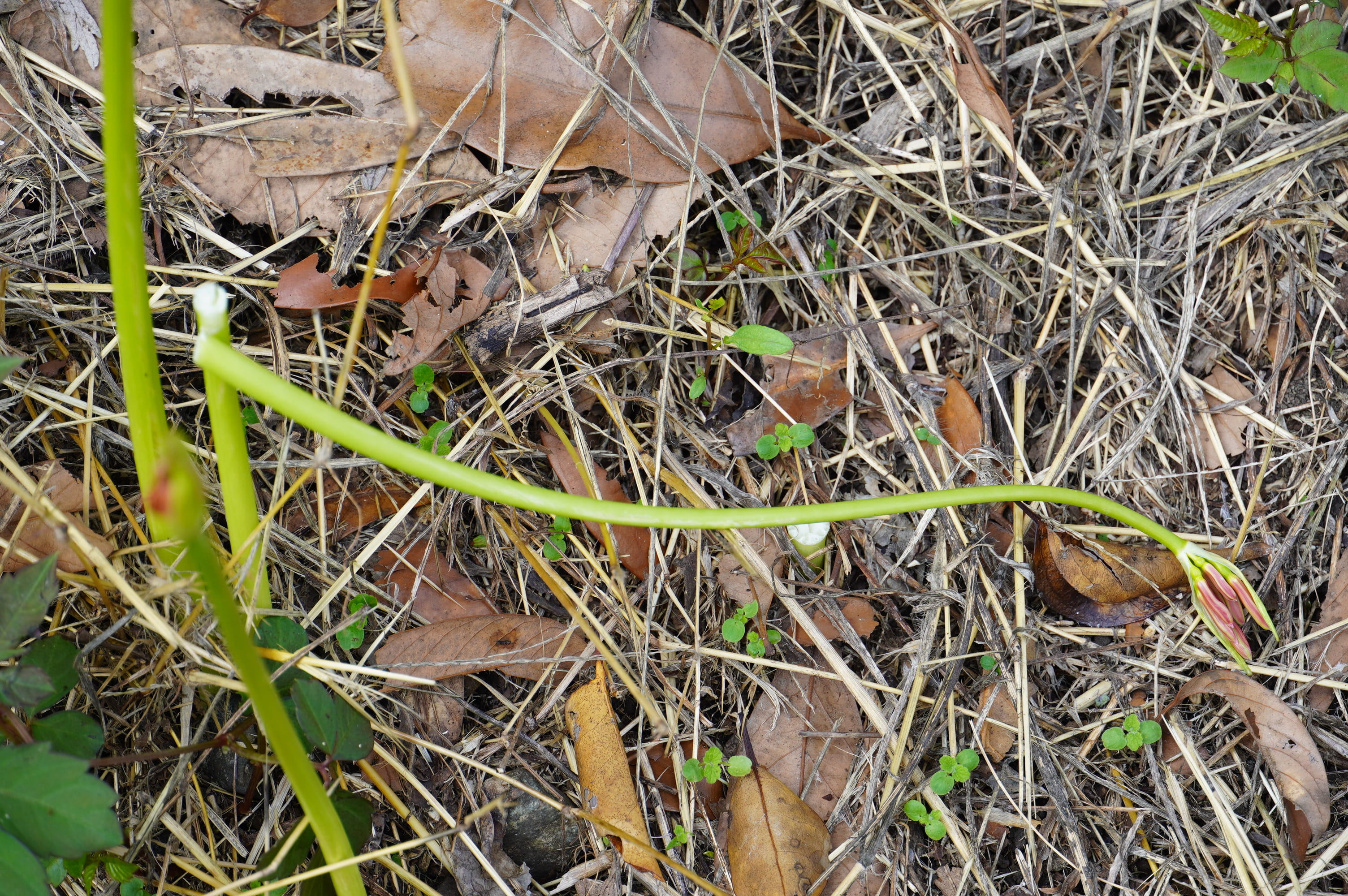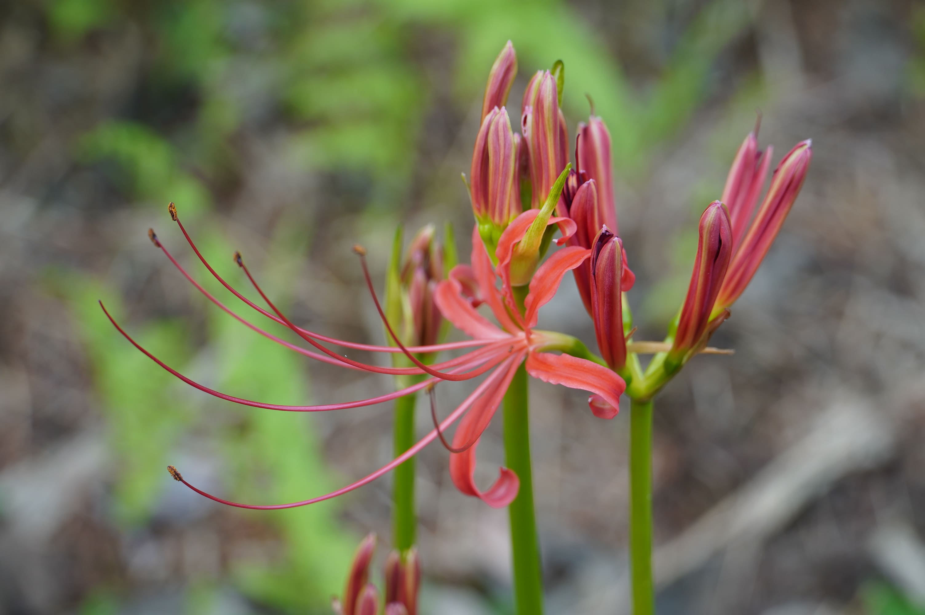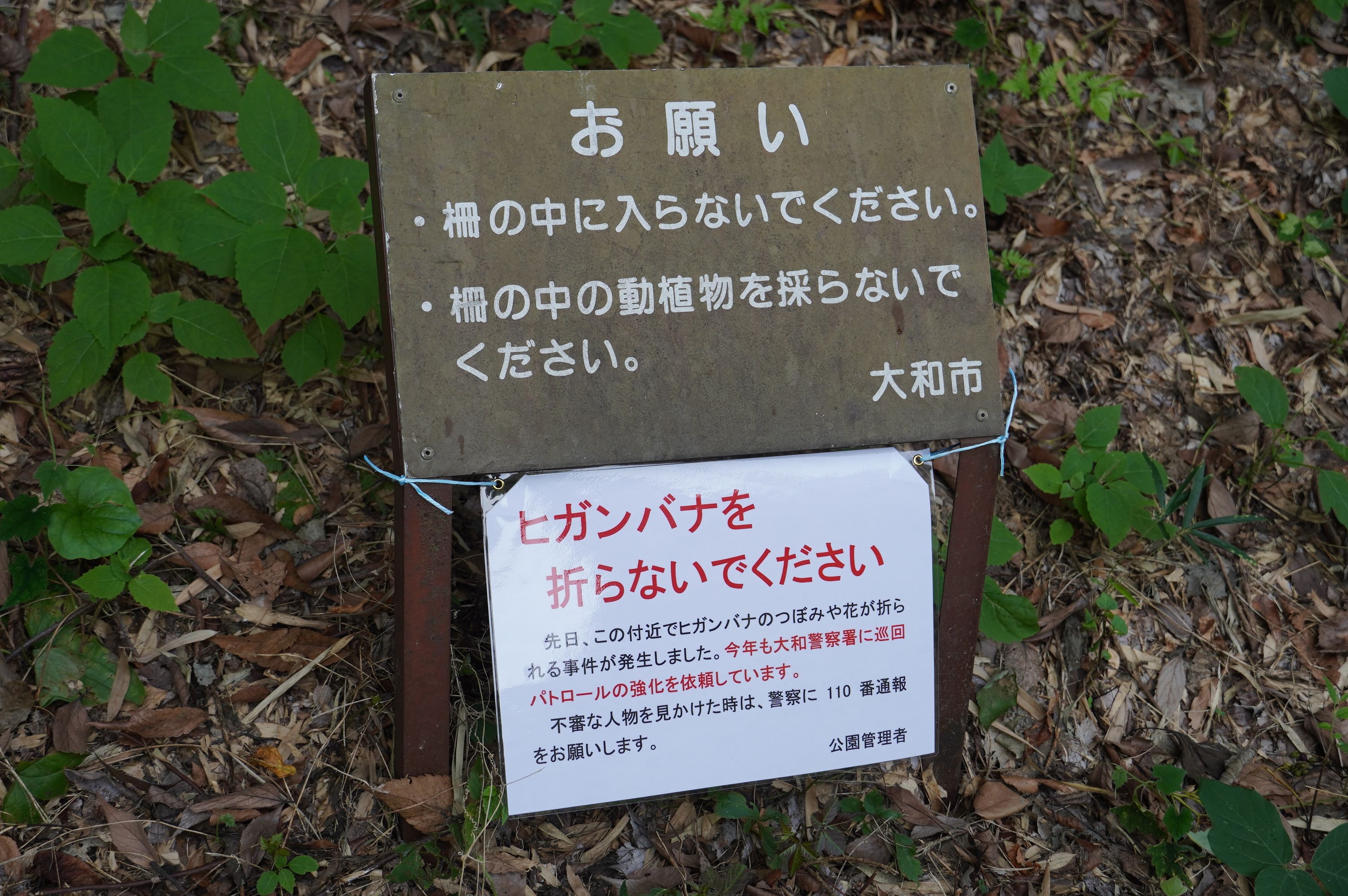 このヒガンバナ斜面では、毎年残念なできごとがあります。ヒガンバナの花茎を切ったり、折ったりしている人がいるようです。今年も数本、園路沿いのヒガンバナが被害にあいました。警察に巡回を依頼していますが、そのような場面を見た方は、警察かしらかしのいえにご連絡いただけると助かります。