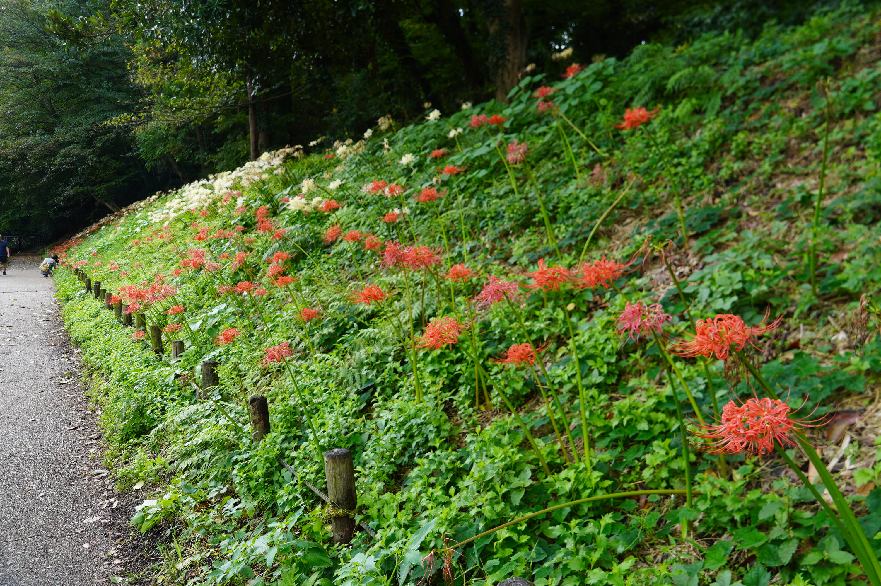 泉の森南部、引地川沿いにあるヒガンバナ斜面は、日当たりがよくないので、見頃は来週になると思います。今は白いヒガンバナが50本程度開花し、花茎もだいぶ増えてきました。白い花が多いエリアですが、赤い花が咲くのはもう少し先になりそうです。