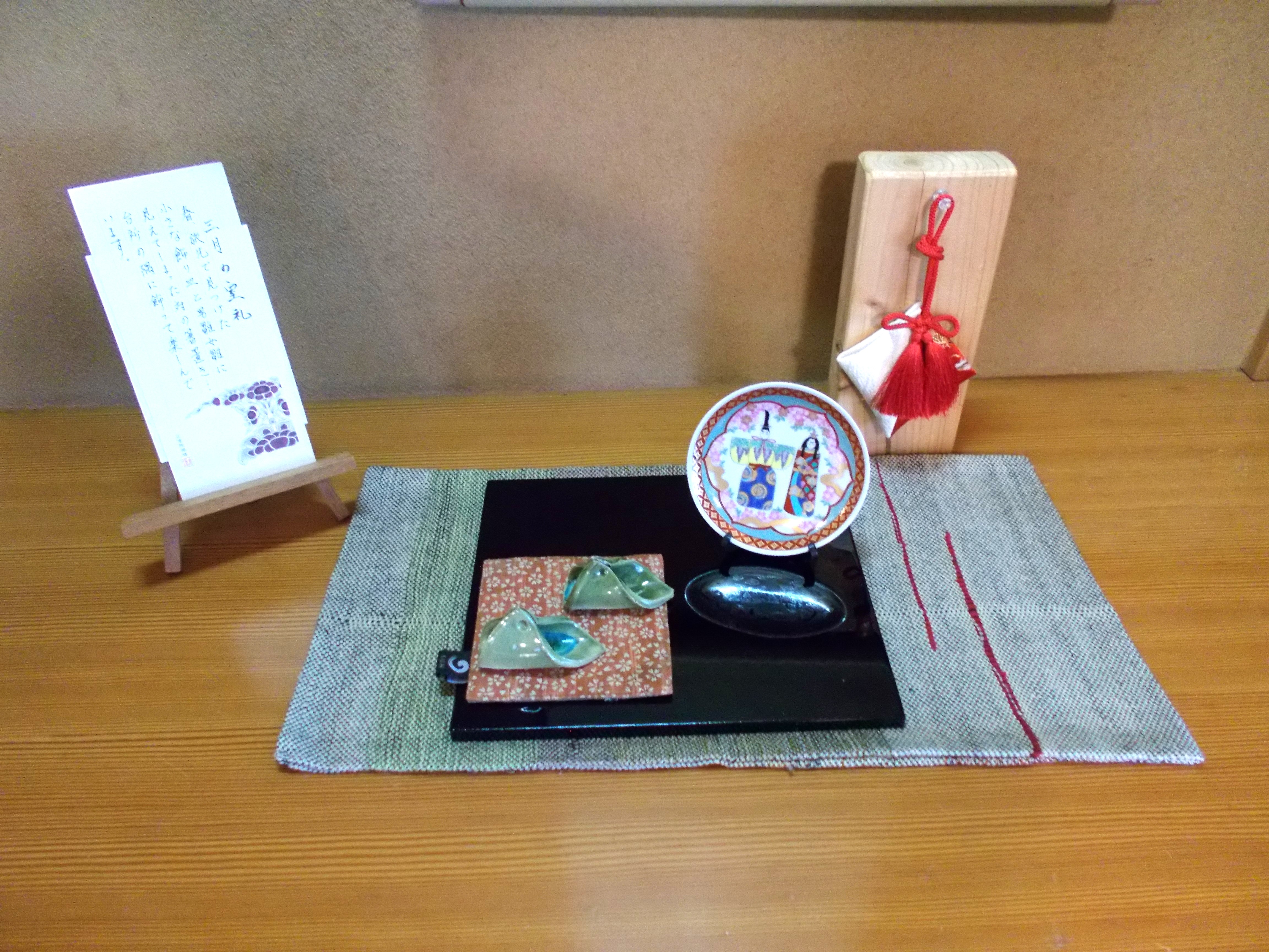 春、旅先で見つけた小さな飾り皿と、男雛女雛に見えてしまった対の箸置き・・・
