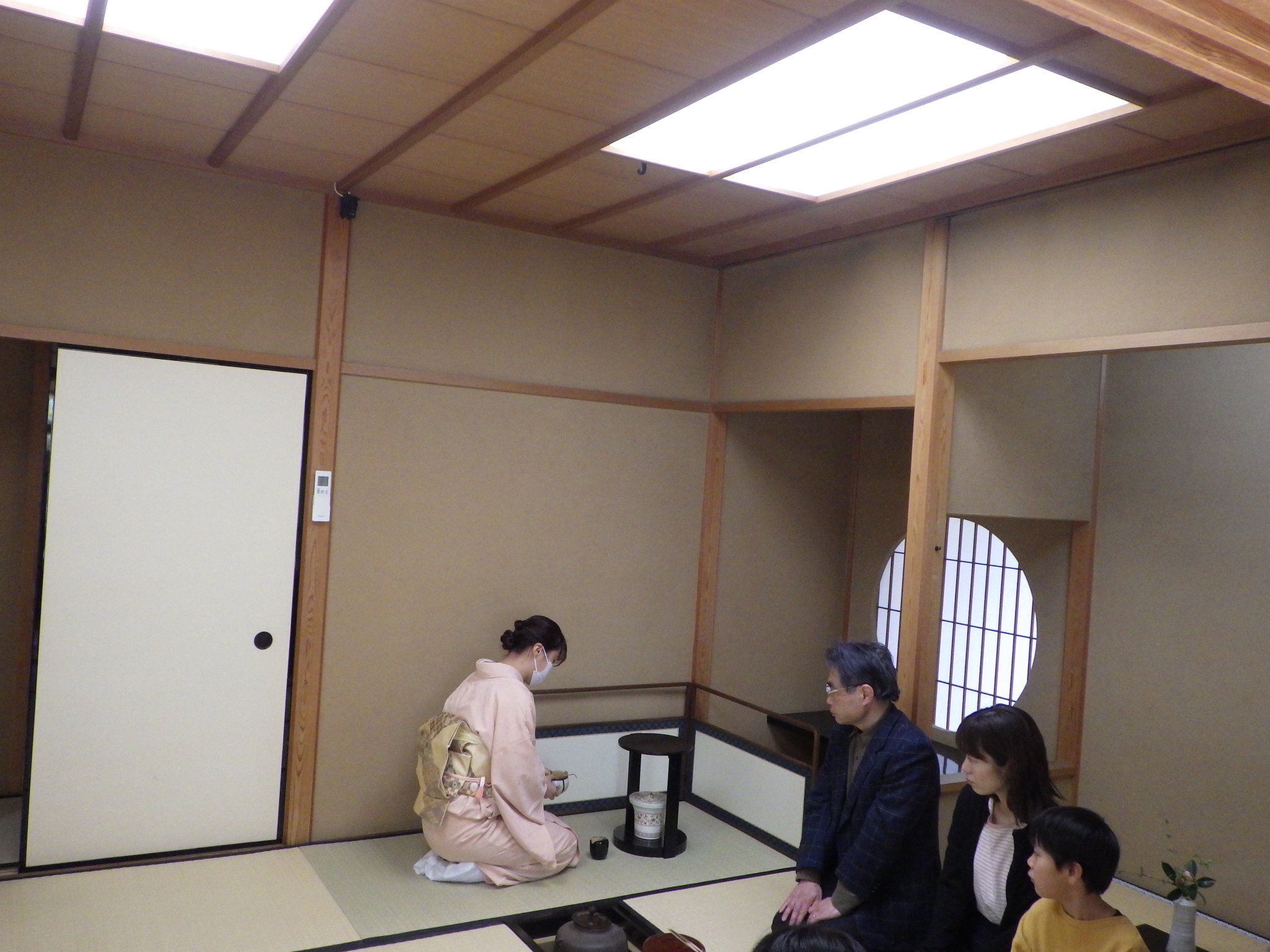 今回は、午前の部と午後の部に分かれ、和室でのお茶席体験、立礼でお茶を点てる体験、本格的なお茶室『慈緑庵』の見学を行いました。