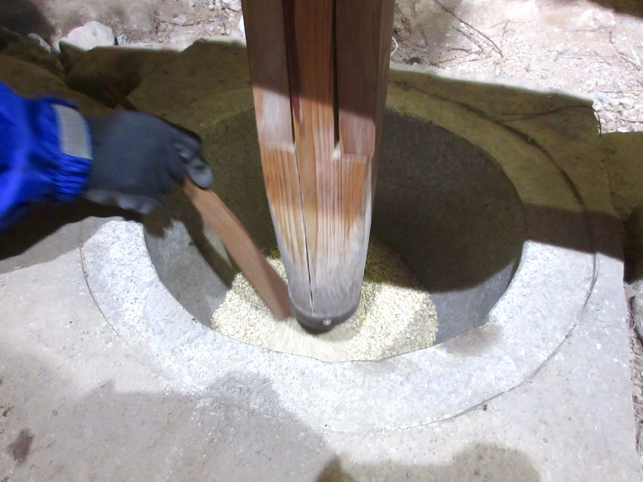 水車小屋の中には、水車の回転によって動く杵(きね)と臼(うす)があり、これらを使って籾摺り・精米を行います。