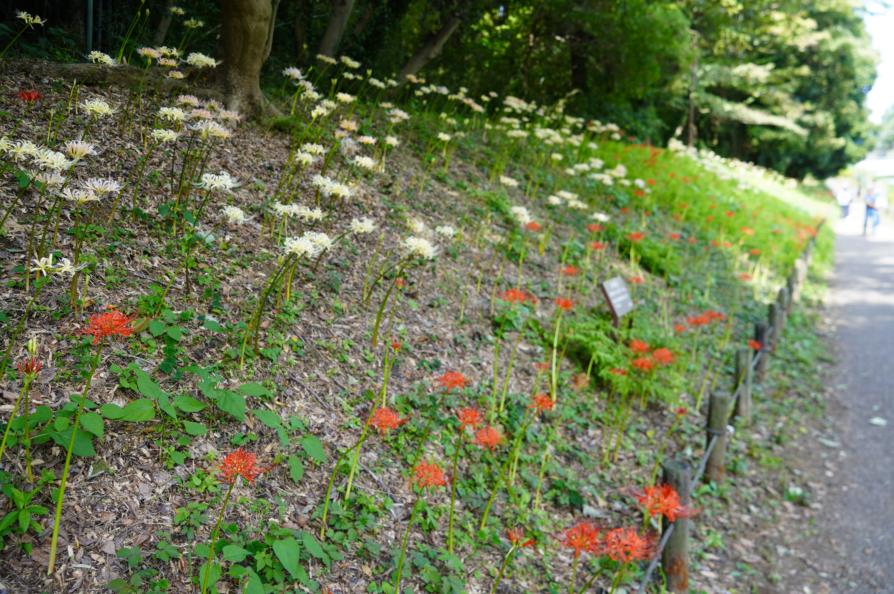 ヒガンバナ斜面のヒガンバナは、見頃を迎えています。斜面南側は手前側の赤花が開花し、赤白両方楽しめるような状態です。白花は傷んだものが増えてきました。斜面中央はもともと花茎が少ないですが、斜面北側(道路側)は赤花が開花し始めています。この土日は、ヒガンバナの鑑賞に最適でしょう。来週は少しずつ傷んだ花が増えてくると思うので、お早めにご覧ください。
