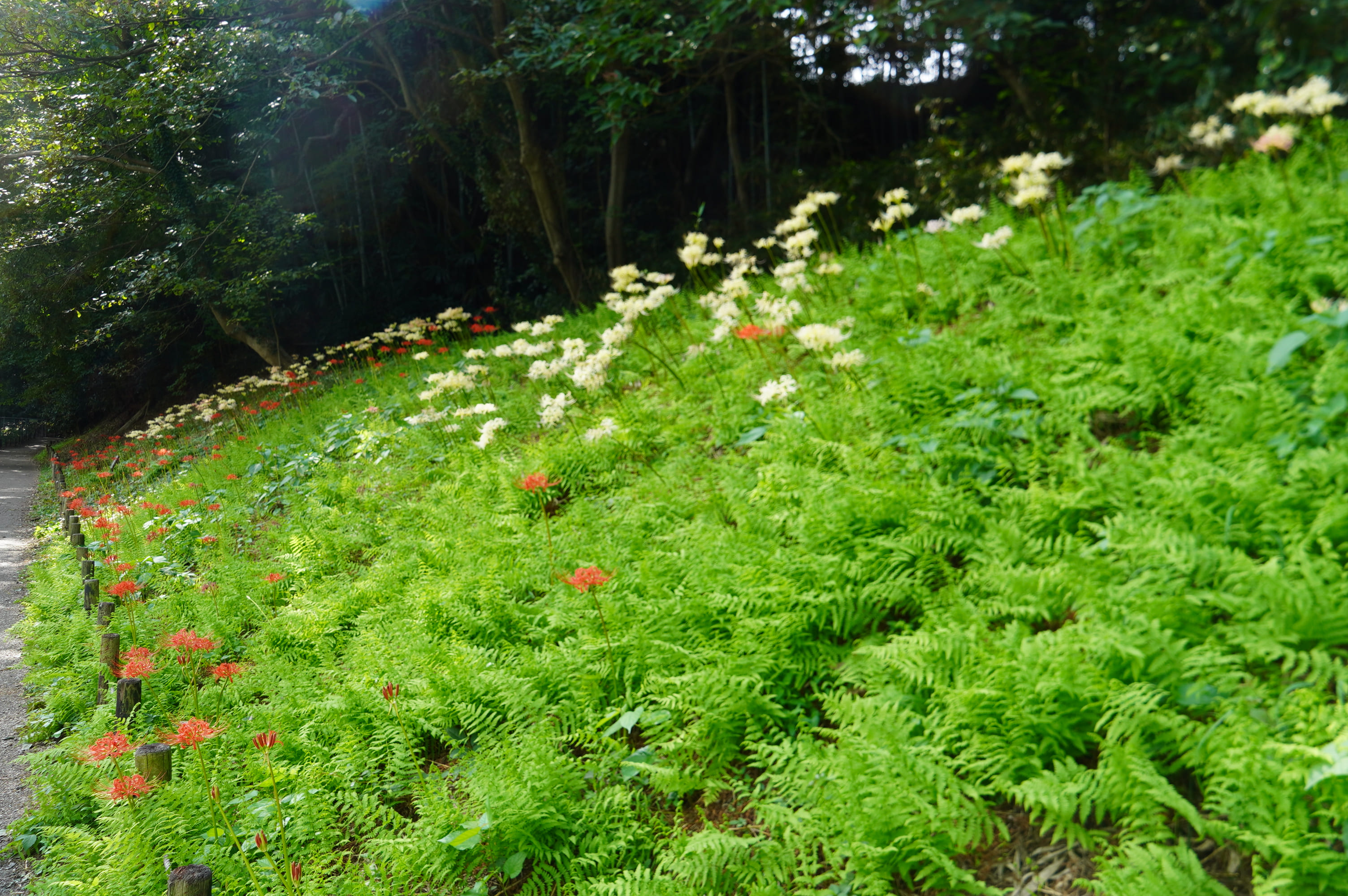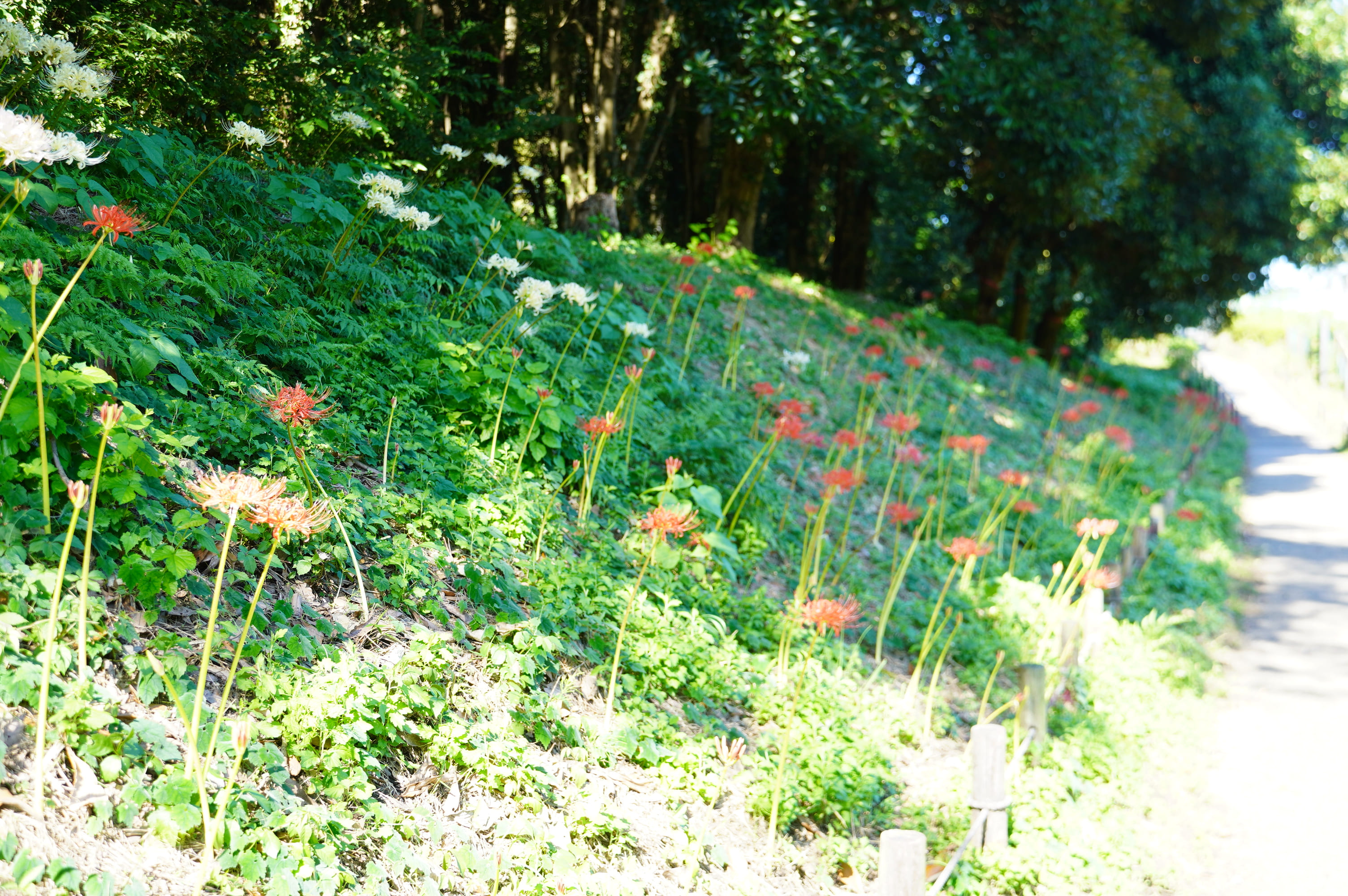 ヒガンバナ斜面は、赤花がまだ少ない状態ですが、白花が見頃を迎えています。開花後に数日で花がなくなるので、早めに咲いた中央エリアはすでに見頃を終えた花もちらほら出てきました。