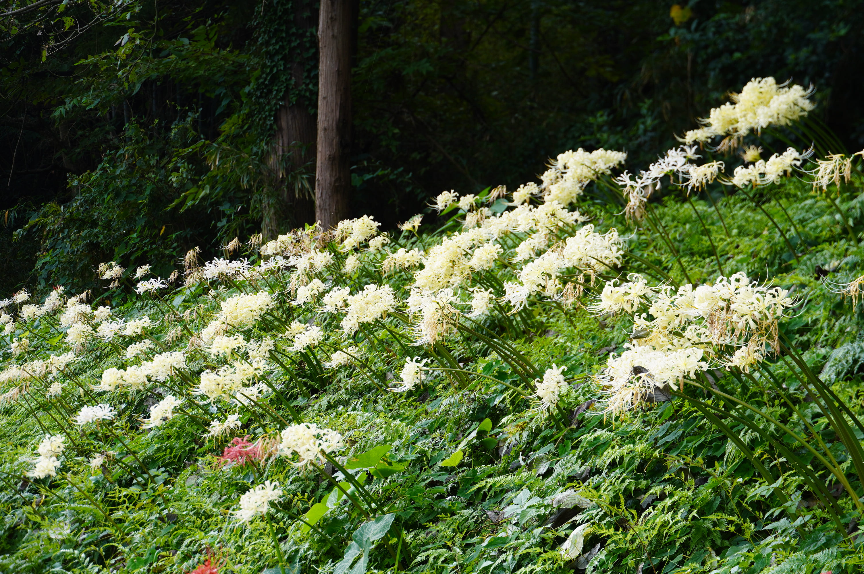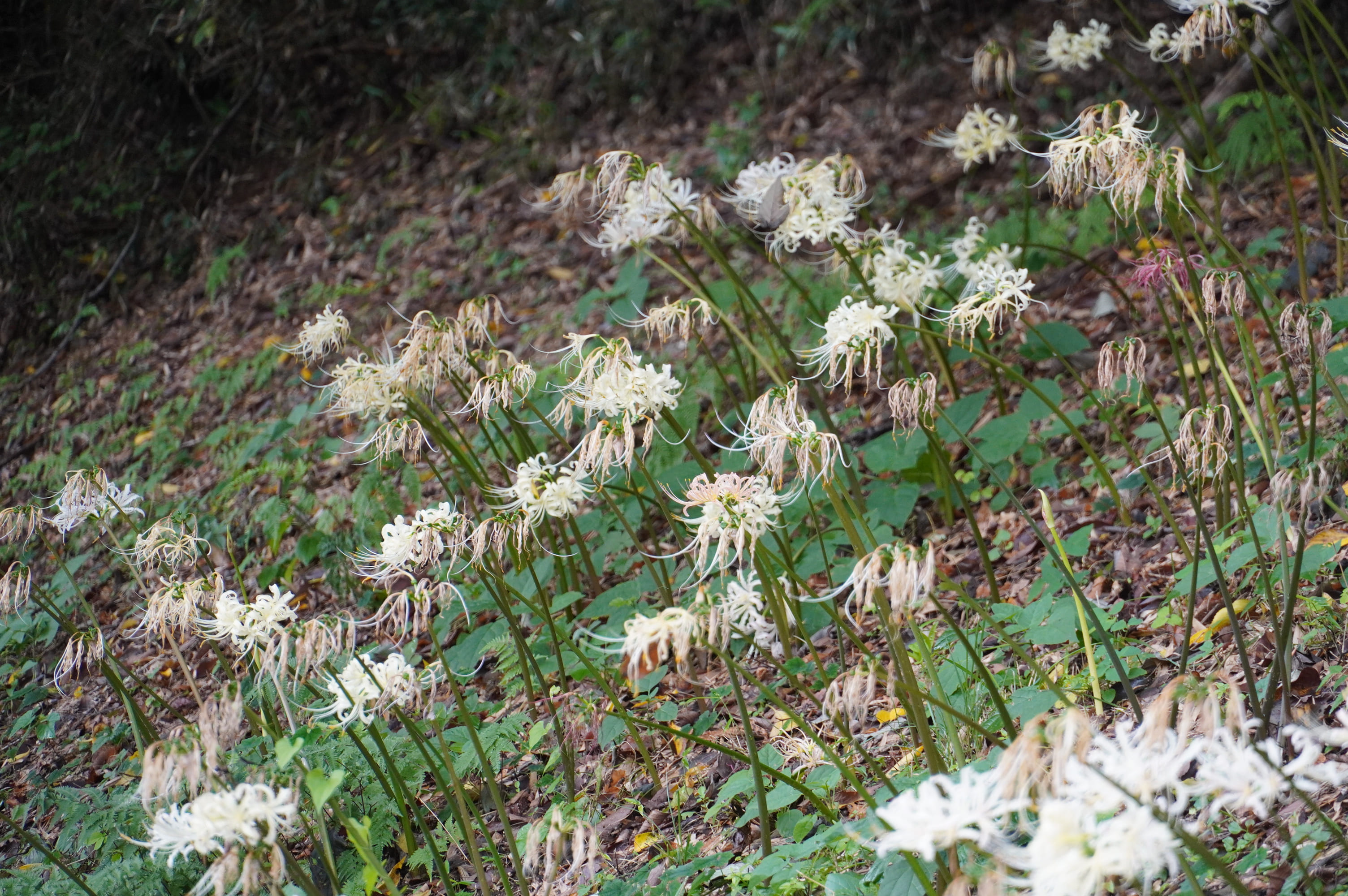 一方、白いヒガンバナは、ヒガンバナの原種「コヒガンバナ」と黄色い花をつける「ショウキズイセン」の雑種と考えられています。白花の一部がピンク色になっているのは、コヒガンバナ由来の赤色が強く出ているということなのでしょう。