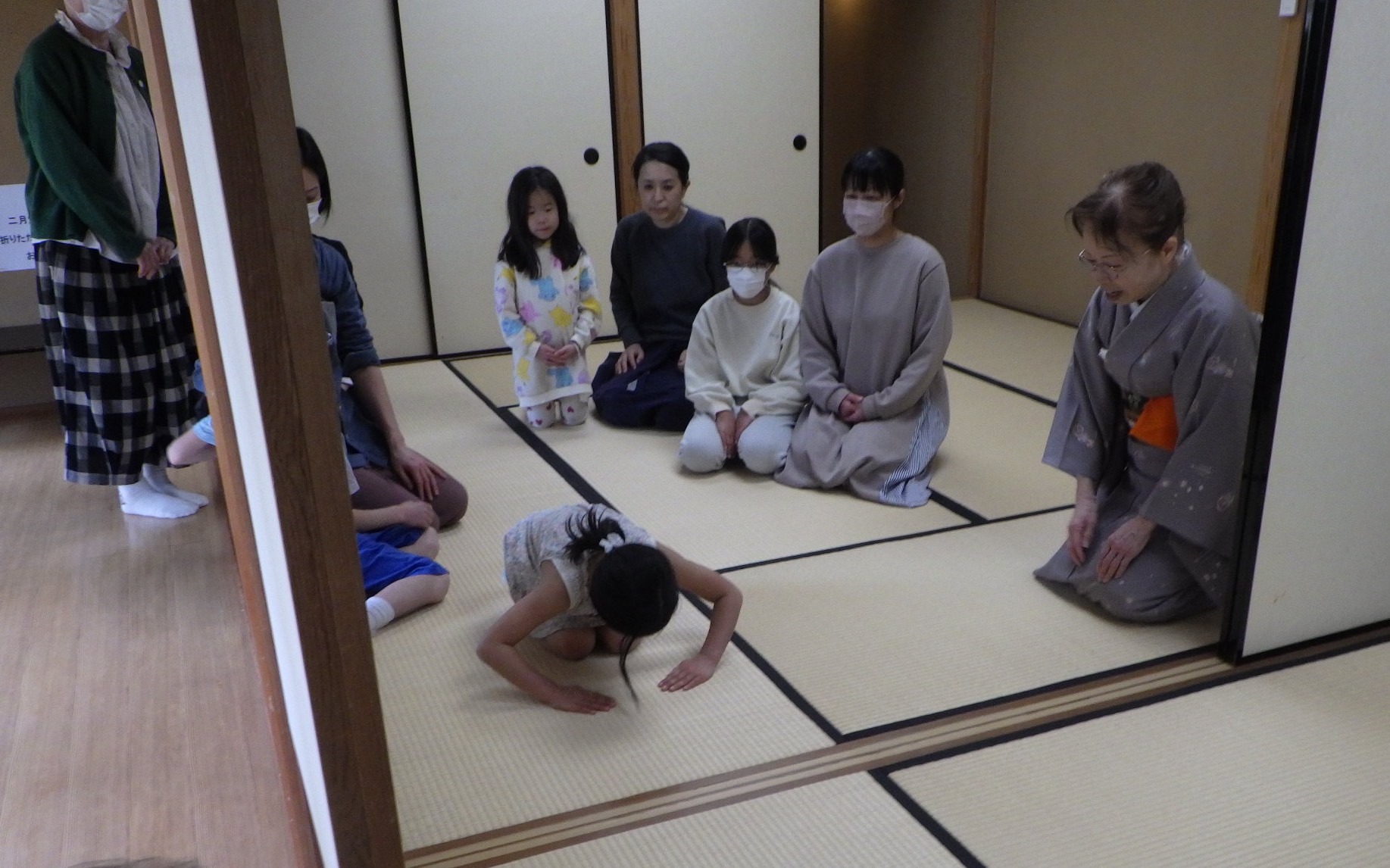 先生方に見本を見せていただいた後、お辞儀の仕方を体験しました。