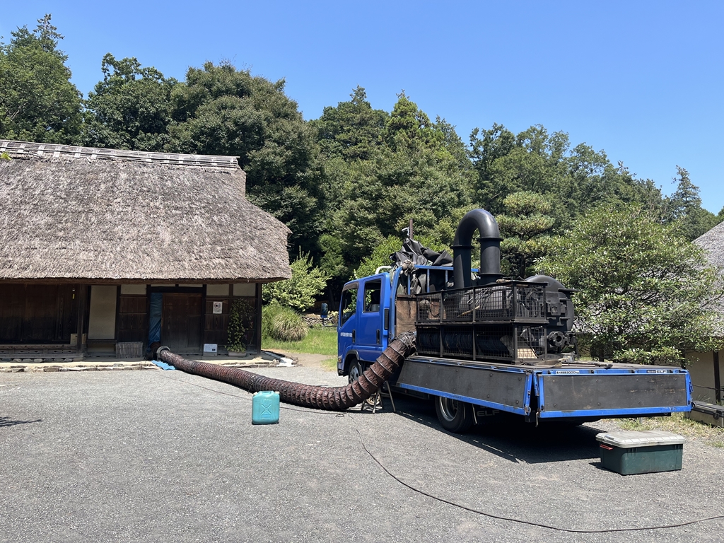 14日の燻蒸作業ではスーパーケムラーという専用の装置を用いて、普段のメンテナンスでは行き届かない部分まで燻蒸を行います。終日民家内への立ち入りはできませんが、外からの見学は可能です。貴重な文化財を今後も安全に見学できる状態を保つための大事な作業ですので、何卒ご理解のほどよろしくお願いいたします。