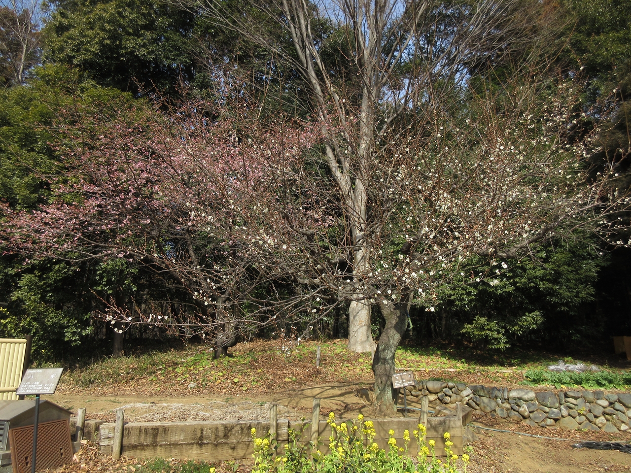 旧北島家近くの畑で、カンザクラが開花し始めています。民家園内では毎年一番乗りで開花するサクラで、鮮やかなピンク色の花をつけています。お隣の白梅は、今年はカンザクラに少しだけ遅れて開花し始めました。この2本は、ほぼ同じタイミングで見頃を迎えるのではないでしょうか。根元のナノハナとともに、一足早く春らしさを感じられる一帯となっています。