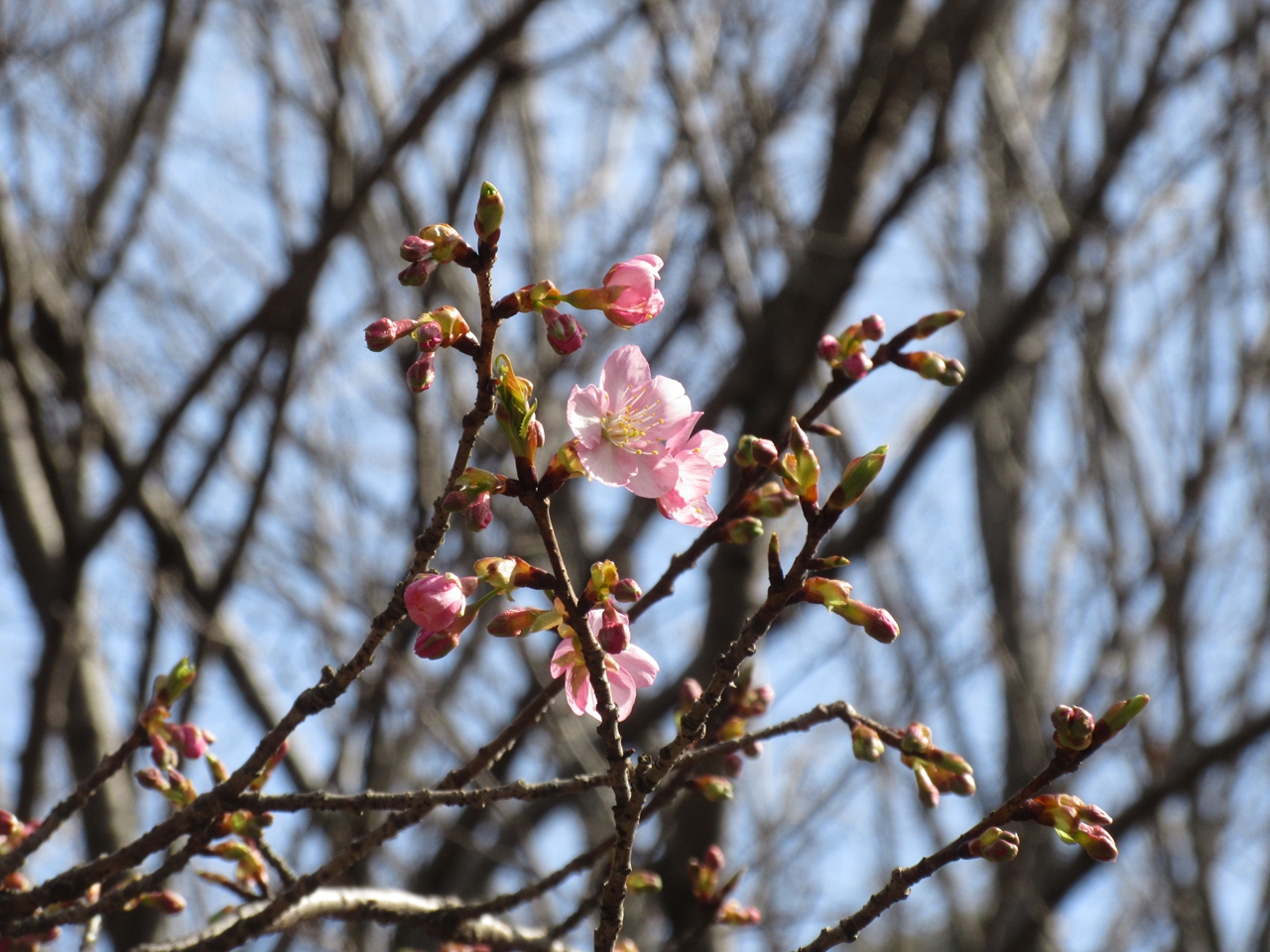 民家園入口外のカワヅザクラも、ちらほらと花が開き始めています。園内のカワヅザクラよりも毎年早く開花が始まる1本です。