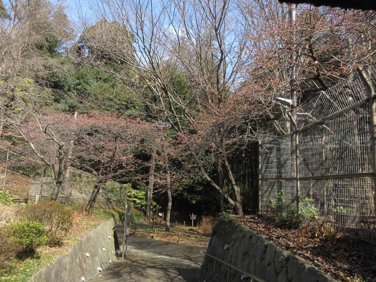 入口から見える、まだまだつぼみの多いカワヅザクラ