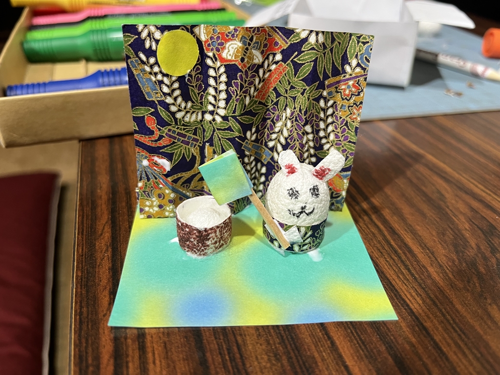養蚕農家だった旧北島家で夏に飼育したカイコのまゆを使い、十三夜にちなんで餅をつくうさぎを作りました。