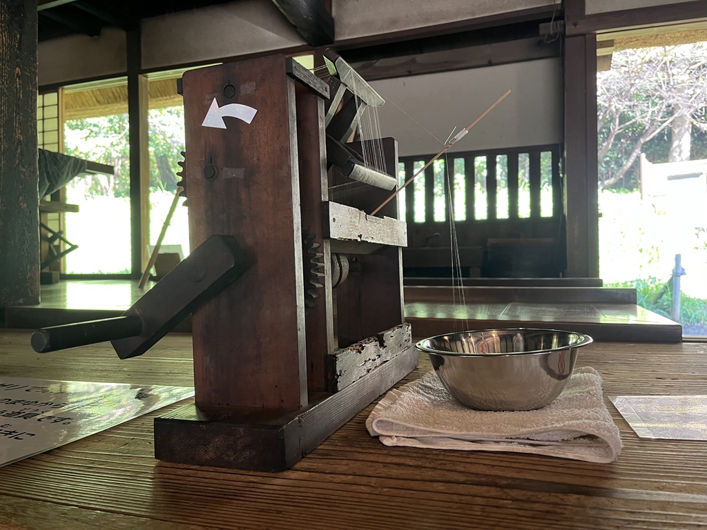 そのほかに、普段は旧北島家の中で展示している「ザグリ」という道具を使って、複数の繭から引き出した糸を、1本に合わせて巻き取っていく繰糸の体験も行いました。こちらは一般の来園者の方にも体験していただきました。繭が糸になることが視覚的に理解できたのではないかと思います。