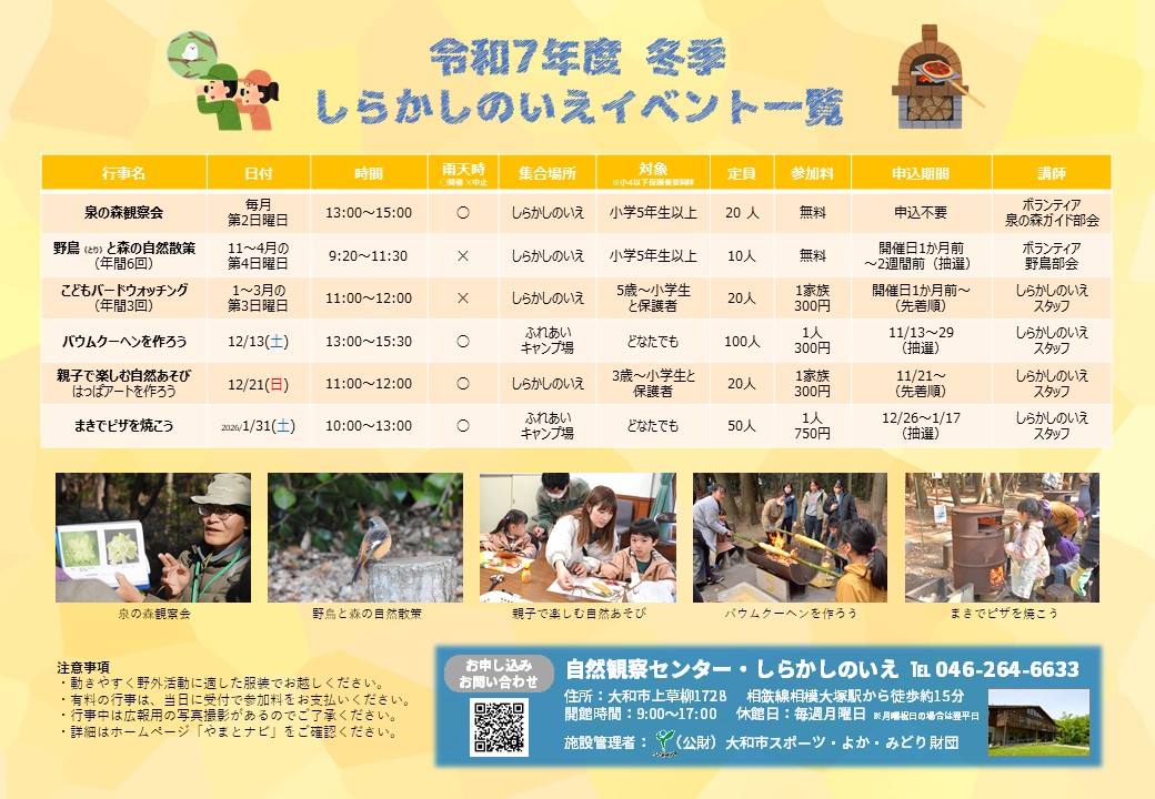 令和7年度に泉の森や自然観察センター・しらかしのいえ、泉の森ふれあいキャンプで開催する、すべてのイベントを一覧表にしました。(公財)大和市スポーツ・よか・みどり財団やしらかしのいえボランティア協議会が、企画・実施します。申込方法は①当日受付、②1か月前からの事前申込制(先着順)、③1か月前からの事前受付(抽選)の3種類となります。興味があるイベントがあれば、ぜひご参加ください。 ※参加料は比較的低額に設定しています。